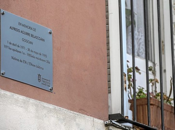 Las placas se han colocado en el número 16 de la Bajada de Xabier, donde murió Alfredo Aguirre Belascoain, de 14 años, al recibir el impacto de una bomba el 30 de mayo de 1985; y en la confluencia de las calles Marcelo Zelaieta y Bernardino Tirapu, en Arrotxapea, donde estaba el bar Porrón y falleció el policía Ángel Postigo Mejías el 15 de junio de 1980. Incluyen la inscripción «En memoria de», en euskara y castellano, junto al nombre de la persona, las fechas de nacimiento y muerte y las palabras «víctima de ETA».