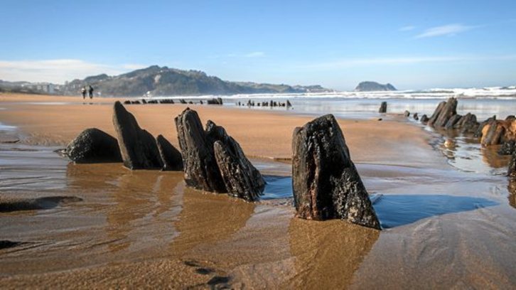 Armak zeramatzala pentsatuta tropa karlistek 1874ko abenduaren 12an hondoratutako “Gustav” ontzi alemanaren hezurduraren arrastoak agerian geratu dira aste honetan Zarauzko hondartzan, itsasaldi bortitzen poderioz: urak harea kopuru handitan eramaten duenean gertatu ohi da bistaratzea. Iñurritza ibaiaren itsasadarrean urperatu zuten “Gustav”, hango duna ederraren eta Talaimendiren parean.Gorka RUBIO | ARGAZKI PRESS
