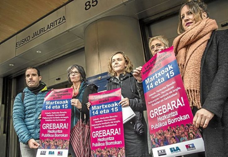 Martxoaren 14 eta 15erako grebara deitu dute LAB, ELA eta Steilasek, Araba, Bizkai eta Gipuzkoako unibertsitatez kanpoko hezkuntza publikoan eta haur eskoletan. Hezkuntza Sailarekin biltzea espero dute eta «proposamen zehatzak» eskatu dizkiote, negoziatzen hasteko.