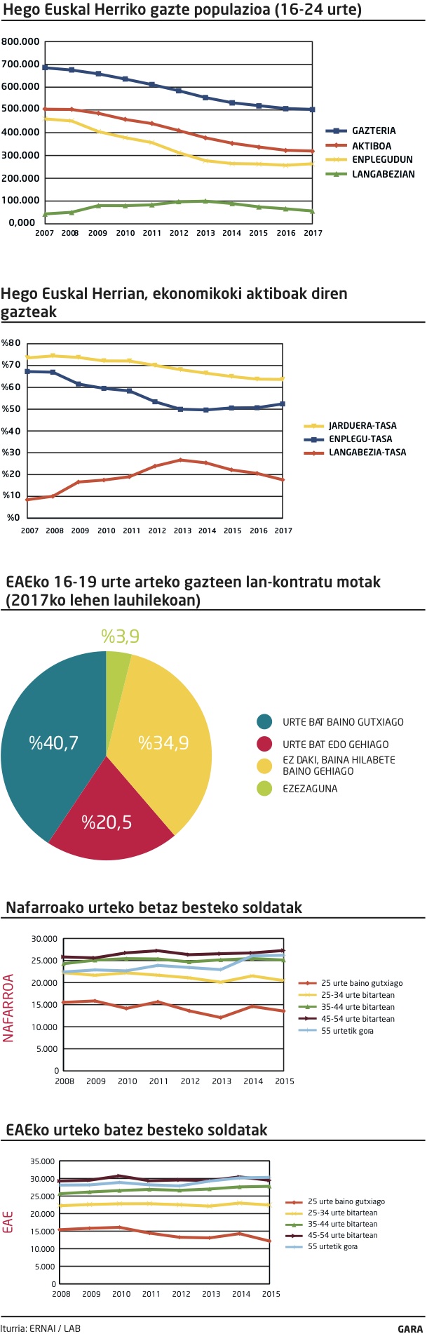 Baina langabezia tasaz harago, badira beste aldagai batzuk gazteen bizimodu prekarioa areagotzen dutenak. Izan ere, enplegua edukitzea ez da bizi kalitate duinaren sinonimo. Kontratu motez ari gara, alajaina. 2017ko lehen hilabeteei dagokienez, EAEn 16 eta 29 urte bitarteko biztanleria aktiboaren %40,7k urtebetetik beherako iraupena zuen kontratua izan zuen, eta horiei batu behar zaie zehatz-mehatz jakin ez baina hilabete bat baino gehiagoko %34,9 kontratu. Nafarroari dagokionez, adin tarte berean, %31,6 ziren lau hilabetetik urtebeterako kontratua sinatu zuten gazteak, eta %30,6k ez zekiten iraupena zenbatekoa izango zen –hilabete baino gehiago izango zela soilik–. Are gehiago, Nafarroako 25 urtetik beherakoen %65,7k izan zuten aldi baterako kontratua iazko urtean.