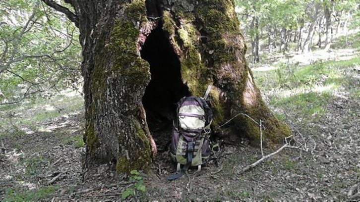 Continuamos la dirección de descenso, pasamos una valla y nos adentramos en el nuevo quejigar, donde encontraremos un viejo quejigo a la izda, de más de metro y medio de diámetro de tronco, que tiene una entrada a su oquedad. Continuando el descenso por la derecha, encontramos otro gran bello ejemplar, aunque de dimensiones menores en una curva y es el preludio antes de llegar a la pista inferior.