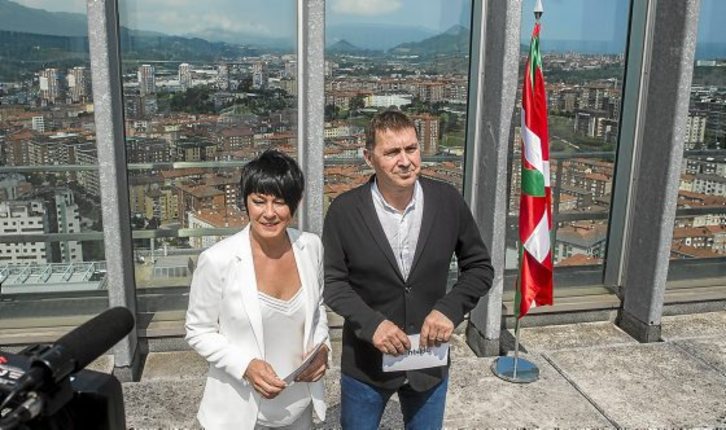 La portavoz de EH Bildu en el Parlamento de Gasteiz, Maddalen Iriarte, y el coordinador general de la formación, Arnaldo Otegi, se subieron ayer a lo más alto de la torre del BEC para, con la imagen de Ezkerraldea como testigo, certificar el carácter «histórico» del acuerdo alcanzado con el PNV y en algunas materias también con Elkarrekin Podemos, sobre las bases con las que ha de redactarse el Nuevo Estatus Político para Araba, Bizkaia y Gipuzkoa, al tiempo que subrayaban que «hemos convertido los derechos sociales en el eje vertebrador de nuestro autogobierno».