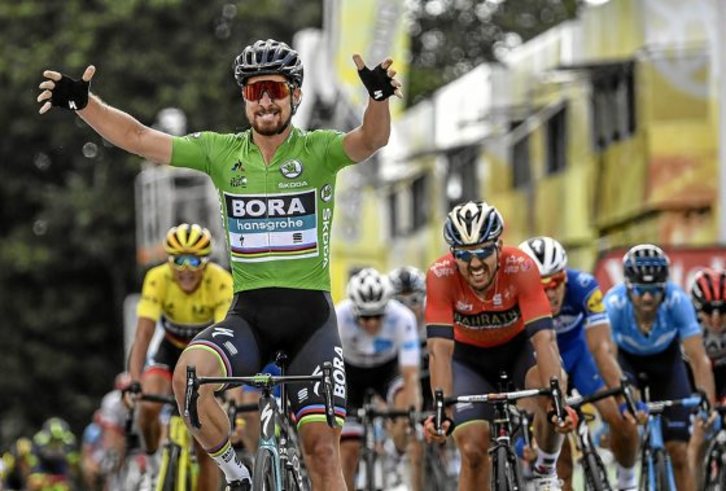 Peter Sagan (Bora) se impuso ayer en la quinta etapa del Tour con final en una subida de un kilómetro al 4,8% en Quimper, en la que superó en el sprint a Collbrelli, Gilbert y Valverde. Todos los favoritos llegaron con el mismo tiempo y Greg van Avermaet mantuvo el maillot amarillo al resistir el ataque del valón del Quick Step en la parte más dura de la subida final.