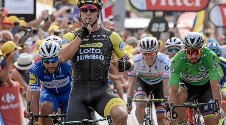 Superó con autoridad a Fernando Gaviria y a Peter Sagan en el sprint de la etapa más larga del Tour, que llegó con mucho retraso por la escasa competitividad de los ciclistas. El Lotto NL anuló una escapada peligrosa en la que se metieron diez corredores importantes.