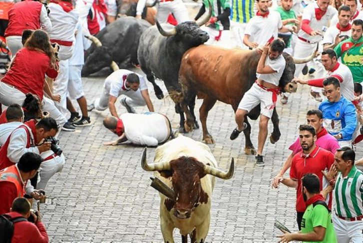 En cuanto a los humanos, aparentemente la de ayer fue la carrera más masiva, como suele ocurrir cuando ya la feria se acaba y encima es fin de semana. En puntos como Santo Domingo que entre lunes y viernes han estado bastante despejados ayer se vio mucha más gente e incluso alguna carrera ante las astas similar a las que se producen en Estafeta, ya en llano y con los toros más cansados. En la parte de Telefónica la aglomeración resultó ya importante. Y tuvo mucho que ver en la cogida más espectacular de este 2018 que cierra con susto morrocotudo y con la pena de siempre.