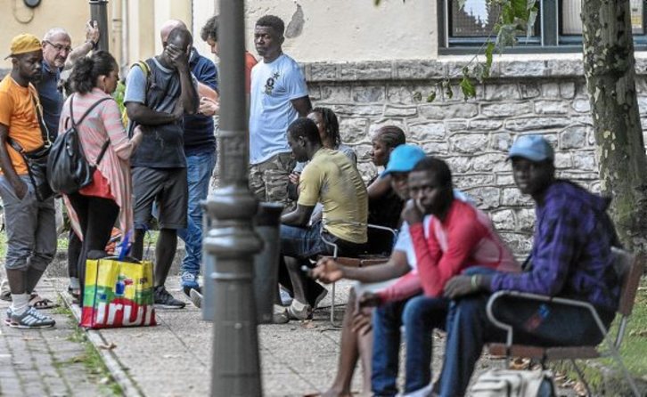 Ayer, viernes, unos 30 migrantes durmieron en el aparcamiento de la estación de ferrocarriles de Irun, y exceptuando tres, los demás eran nuevos por esos lares. El tránsito de los subsaharianos no cesa en la localidad fronteriza y para atender sus necesidades básicas resulta indispensable la ayuda del dispositivo de la Cruz Roja, así como de los voluntarios, vecinos de a pie de Irun. Porque el operativo «oficial» –por así llamarlo– no llega para cubrirlas en su totalidad. El más rápido, el más atento, tendrá su día cubierto si «reserva» uno de los 28 tickets que ofrece la Cruz Roja, en el que entran cama, ducha, comida y cena –la alimentación corre a cargo de la Fundación Rais–.
