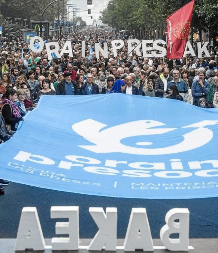 La reivindicación «Orain presoak» llega desde la movilización que en diciembre de 2017 llevó a París la demanda de compromisos políticos para solucionar la situación de los presos vascos. Casi un año después, 37.000 personas tomaron las calles de Donostia para profundizar en esa reivindicación. Y lo hicieron con una cabecera muy plural, la más plural hasta el momento, ya que la mayoría de sindicatos del país así como representantes de EH Bildu, PNV, Elkarrekin Podemos, EH Bai, EELV y CUP se sumaron a la manifestación.