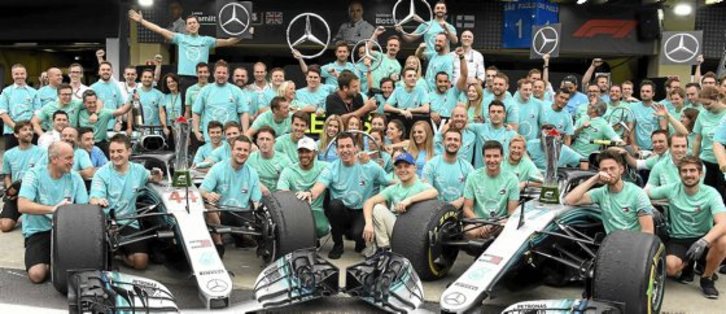Mercedes hizo doblete, pues también ganó el mundial de escuderías, un título que logra por quinto año consecutivo. Ello fue posible gracias a la victoria de Lewis Hamilton en Interlagos, la primera carrera en la que se aupa a lo más alto del cajón siendo ya campeón del mundo y el triunfo 72º en su trayectoria deportiva como piloto.