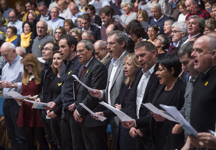 «Es emocionante estar esta noche aquí. Pocas noches como las de hoy me he sentido tan orgulloso de representar a mi país. Vascos y catalanes, siempre juntos caminando hacia la libertad». Así comenzó la intervención del president catalán, Quim Torra, anoche en el Kursaal de Donostia, en el acto organizado por Gure Esku Dago. Fue una declaración de intenciones con el corazón en la mano. Y casi una hora después, tras repasar la situación actual y las opciones futuras de su proceso, cerró así: «Marchemos juntos vascos y catalanes, juntos somos más fuertes y más libres. Como catalanes, estaremos siempre al lado en la lucha por la libertad de Euskal Herria. Gu, beti Euskadirekin», parafraseando en inversa la histórica proclama del lehendakari José Antonio Agirre.