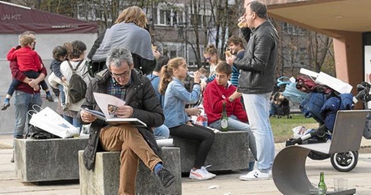 Liburuak, sagardoa, gitarra elektrikoak, tortilla pintxoak, haur kotxeak, poltsak (paperezkoak edo telazkoak, hori bai), biniloak, berokiak... Denetariko elementuek gurutzatzen dituzte egunotan Landako inguruko espazioak. Eta badute beste berezitasun bat ere: edozein kale bazter bilakatzen da liburutegi (edo taberna) eder. Juan Carlos RUIZ | FOKU