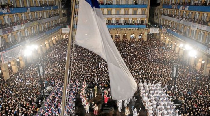 El alcalde Eneko Goia izó la bandera al ritmo de la Marcha de San Sebastián de Sarriegi, a las doce en punto de la noche. Junto a el asistía también Rosa García, a quien este año se ha concedido el tambor de oro. La plaza de la Constitución, a rebosar otro año más, acogió a la infalible compañía Gaztelubide, encargada de abrir el día de San Sebastián.