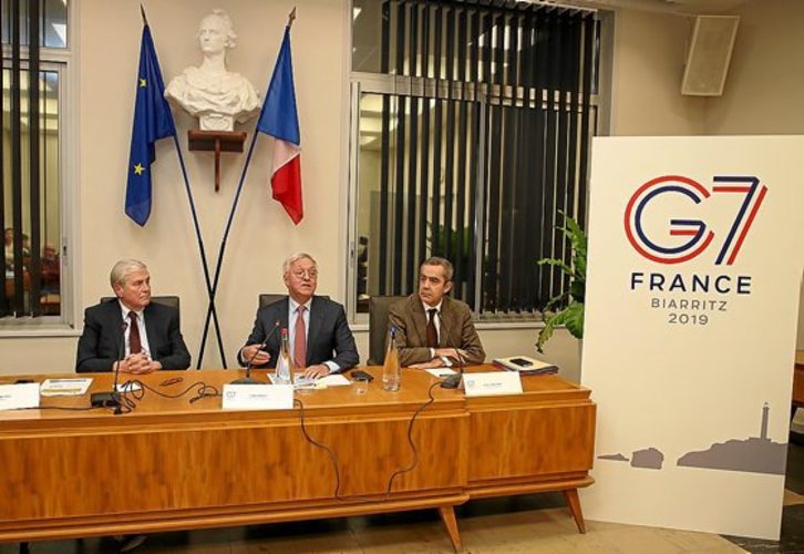 El prefecto de Pirineos Atlánticos, Gilbert Payet, el subprefecto de Baiona, Hervé Jonathan, y el alcalde de Biarritz, Michel Veunac, comparecieron ayer tarde en el Consistorio de la localidad labortana para dar a conocer los primeros datos del dispositivo de seguridad previsto con motivo de la celebración, entre el 24 y el 26 de agosto, de la cumbre del G7. Mientras Veunac trataba de remarcar que el dispositivo de seguridad que se establecerá durante la visita a la ciudad de los mandatarios de siete de los países más ricos del planeta generará «molestias limitadas» a la ciudadanía, el representante del Estado perfilaba la amplia gama de restricciones de seguridad que acompañarán al evento.