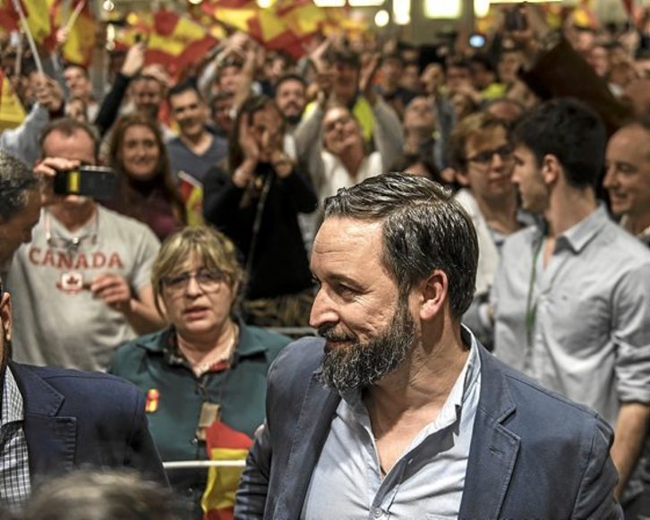 VOX DESEMBARCÓ ANOCHE EN IRUñEA PARA ABANDERAR A «LOS ESPAñOLES QUE NO SE SENTÍAN REPRESENTADOS DESDE HACE 40 AñOS». LA VERSIÓN MÁS DURA DEL RÉGIMEN DEL 78 ATERRIZÓ ANTE CIENTOS DE SIMPATIZANTES COMO GARANTE «DE LA UNIDAD DE ESPAñA» Y TIMÓN DE LA INVOLUCION RETRÓGRADA. SIN COMPLEJO, QUEDÓ CLARO.