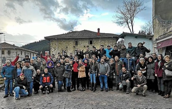 A continuación, se dirigieron hacia su localidad natal. Poco antes de llegar al casco urbano, en el puente de Tubos Reunidos, decenas de personas, en su gran mayoría jóvenes, le dieron la bienvenida con una gran pancarta, banderas reclamando la repatriación de los prisioneros vascos y bengalas.