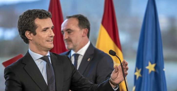 EL LÍDER DEL PP ACUDIÓ A IRUÑEA A RUBRICAR EL ACUERDO CON UPN. DESPUÉS, LOS RESPONSABLES DE CADA PARTIDO SE FUERON CADA UNO POR SU LADO. PABLO CASADO VINO CON INDA PARA MONTAR UNA ESCENITA EN ALTSASU Y LARGARSE CON POLÉMICA. AL LÍDER DE UPN LE FALTARON VALENTÍA Y TABLAS PARA HACERSE VALER.