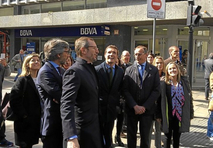 El presidente del PP paseó por la calle Dato acompañado por su número tres, Javier Maroto, y por el presidente del partido en la CAV, Alfonso Alonso, a los que acompañaron el candidato a diputado general, Iñaki Oyarzábal, y la candidata a la alcaldía, Leticia Comerón.