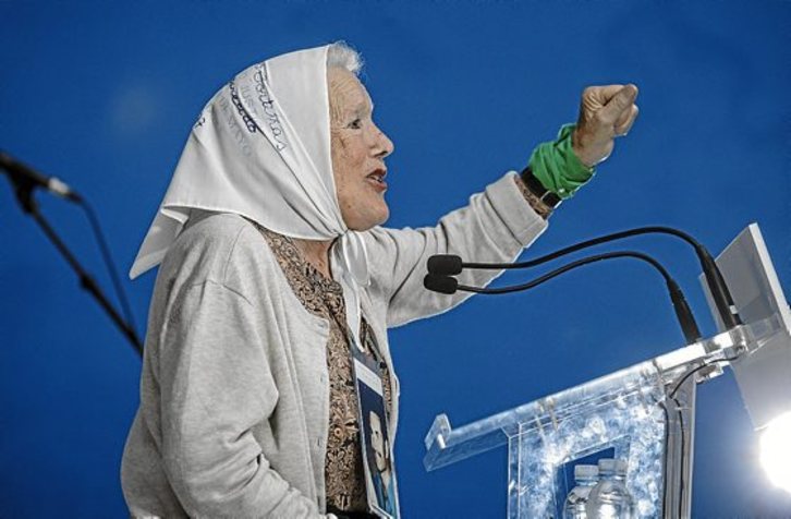 A sus 89 años, despliega una poderosa –y envidiable– energía y fuerza interior. «Las Madres empezamos en esto cuando estábamos en los 50 años, las que quedamos rondamos ya los 90 e, incluso, alguna ha cumplido los cien. Cuando me preguntan de dónde sacamos esta energía, siempre respondo que es algo visceral, que nos sale de las entrañas», afirma Cortiñas en entrevista a GARA antes de regresar.