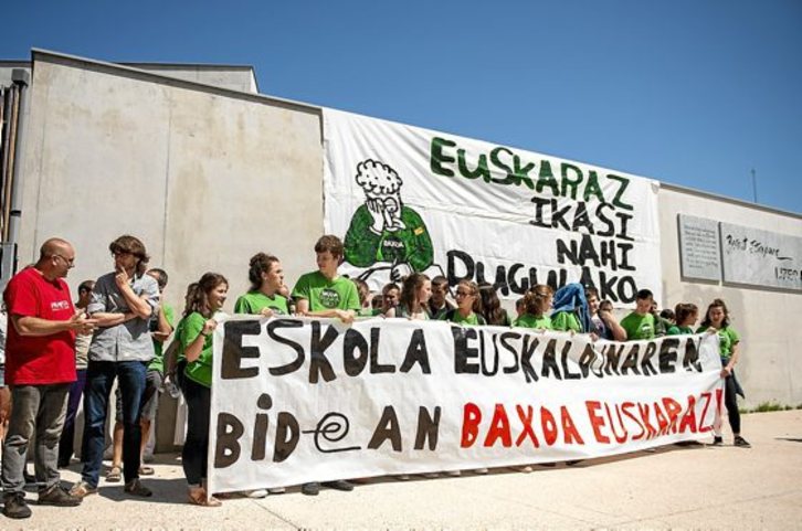 Iaz, Rene Cassin lizeoaren aurrean egin zuten ekimena. Aurten, berriz, Seaskako lizeoa azterketa gune gisa aukeratu dutela baliaturik, bertako atarian egin zuten protesta atzo eguerdian. Fatxadan ezarritako pankarta erraldoiaren azpian, hamarnaka gaztek eskola euskalduntze prozesuan ezinbesteko tresna dela aldarrikatu zuten.