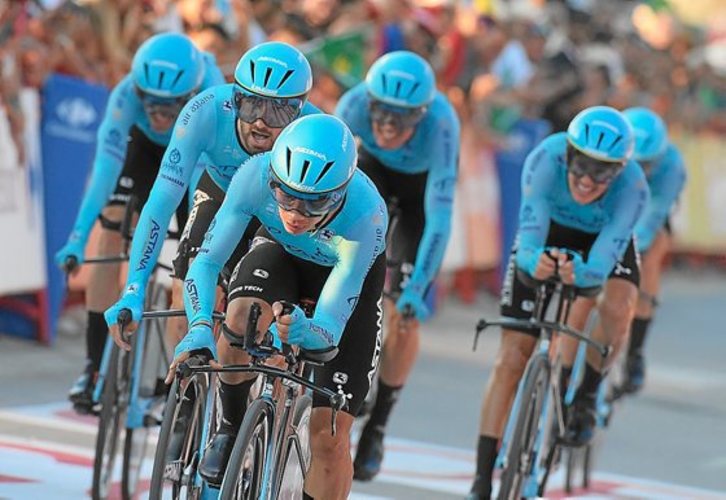 El Astana de los hermanos Izagirre y Omar Fraile logró ayer la victoria en la primera etapa de la Vuelta, una crono por equipos de 13,4 kilómetros en la localidad alicantina de Torrevieja, al aprovecharse de las caídas sufridas por los dos favoritos, Jumbo Visma y Deceuninck. Miguel Ángel López fue el primer corredor del equipo kazajo en cruzar la línea de meta y saldrá hoy con el maillot rojo de líder.