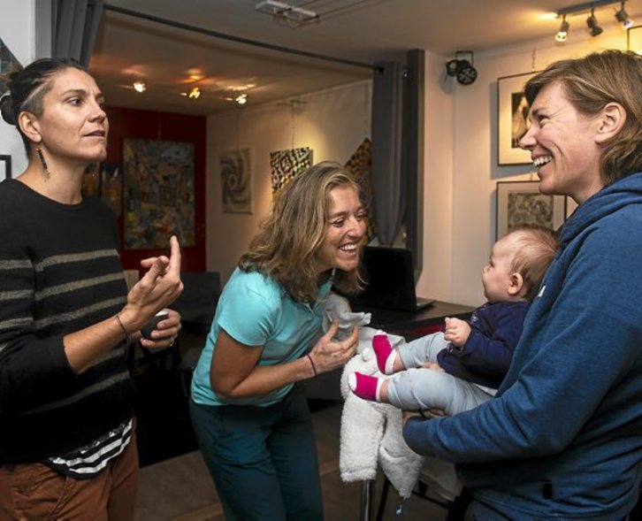 «Nik gure seme nagusia eraman nuen sabelean eta nire bikotekideak, bigarrena», azaldu du Delphinek. Azken urteotan kontzientzien bilakaera positiboa izan dela aitortu arren, «lehenengo prozesua bigarrena baino samurragoa» egin zitzaiela aitortu du. Besoetan du Florencek sabelean eraman zuen alaba, 3,5 hilabeteko Iroise txikia, eta, berak bezala, bere bikotekideak ere sentsazio gazi-gozoak ditu.