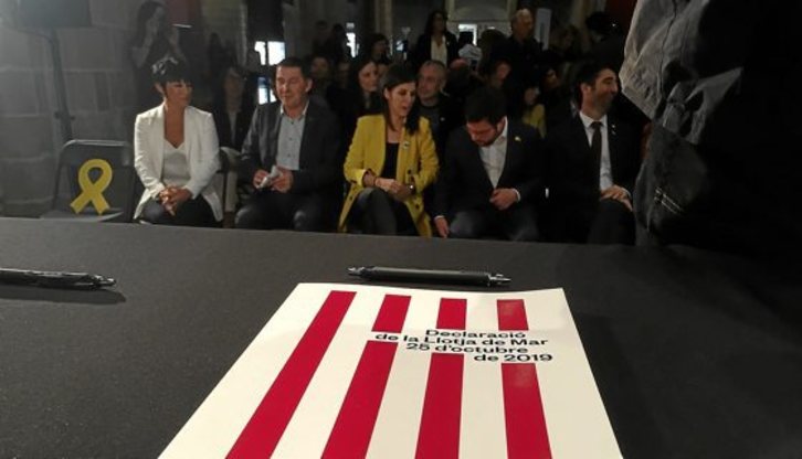 Las decenas de periodistas que acudieron a la Llotja de Mar ayer a mediodía esperaban una fotografía de rechazo a la sentencia del Supremo, pero se encontraron con eso y bastante más. La declaración que llevará el nombre del edificio histórico cercano a la Barceloneta materializa una unidad de fuerzas de largo recorrido, más allá por tanto del febril momento de Catalunya. Incluye un compromiso en torno a cinco puntos que planta cara a la involución estatal, pero se dirige sobre todo a sus propios pueblos y también a la comunidad internacional.