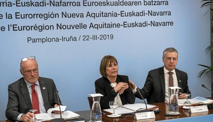 La Eurorregión Nueva Aquitania-CAV-Nafarroa se reúne hoy en Iruñea por primera vez desde que María Chivite es presidenta navarra, por lo que actuará como anfitriona de Iñigo Urkullu y Alain Rousset. Este organismo ha sido objeto, desde sus orígenes, de críticas de la derecha navarra, que lo ha considerado como una herramienta del nacionalismo vasco para diluir a Nafarroa. Hasta que Uxue Barkos llegó al Gobierno, no se integró en la Eurorregión.
