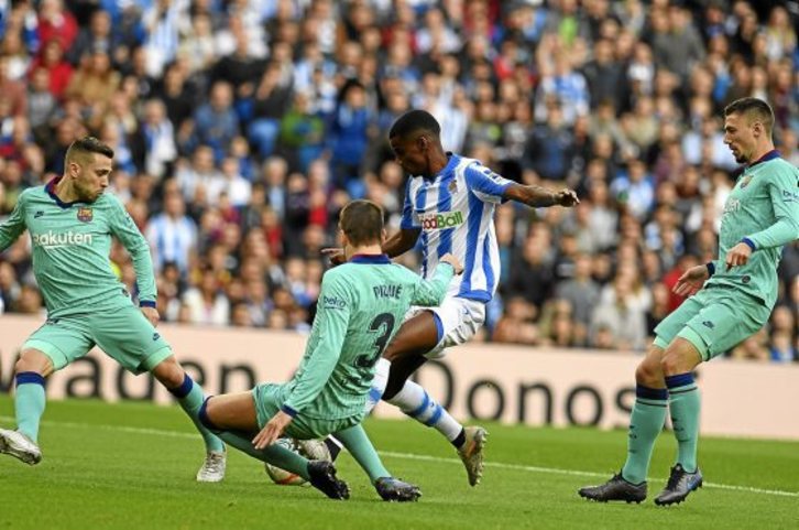 Lo más reseñable del partido fue eso, la valentía con la que lo afrontó la Real, con una presión alta en la que los blanquiazules defendían en individual en todo el campo al acudir Joseba Zaldua a presionar a Jordi Alba, que volvía tras más de un mes de baja y notó esa inactividad. Eso dejaba a los otros tres defensores realistas con los tres cracks que tiene Valverde en la delantera y tuvo un doble efecto. Impidió al Barcelona salir con el balón jugado y permitió a la Real jugar la mayor parte del primer tiempo en campo rival y ser superior, pero esa estrategia también tuvo unas consecuencias negativas porque los azulgranas no tuvieron problemas para jugar directo para salir de esa presión y buscar duelos en igualdad numérica de sus delanteros. Les bastó un error de Diego Llorente para empatar el partido y acabar en tablas una primera parte en la que solo habían tenido hasta entonces un remate desde fuera del área de Luis Suárez.