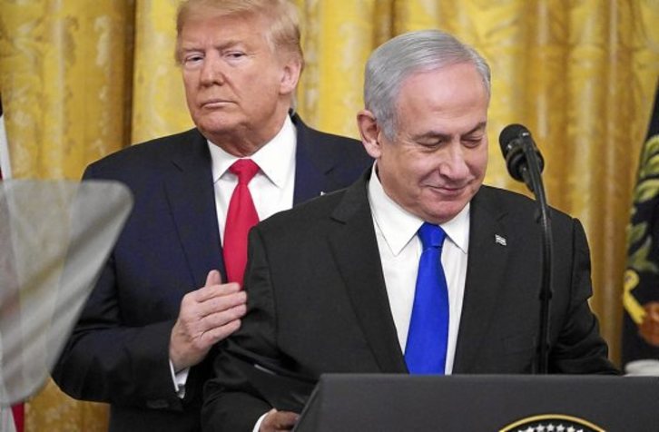 El presidente de Estados Unidos, Donald Trump, y el primer ministro israelí, Benjamin Netanyahu, ambos imputados –uno en pleno juicio de abuso de poder frente a su Congreso y el otro acusado de corrupción– y ambos ante unas próximas elecciones, presentaron ayer el anunciado «plan del siglo» para el conflicto en Palestina.