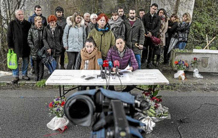 Una veintena de familiares de Sololuze y Beltrán acudieron al lugar, y después de depositar flores en honor a los trabajadores, las sobrinas de Alberto Sololuze, Helene y Olaia Alberdi, procedieron a leer los comunicados. «Alberto y Joaquín desaparecieron mientras trabajaban. No desaparecieron en el mar, sino en un terreno bien delimitado. Todos sabemos más o menos dónde, todos conocemos el lugar, y todos tratamos de ayudar, cada uno desde su disposición, para que les saquen cuanto antes. No pedimos más que lo que es nuestro –indicaron–; los cuerpos, y que se aclare lo ocurrido», dijeron.