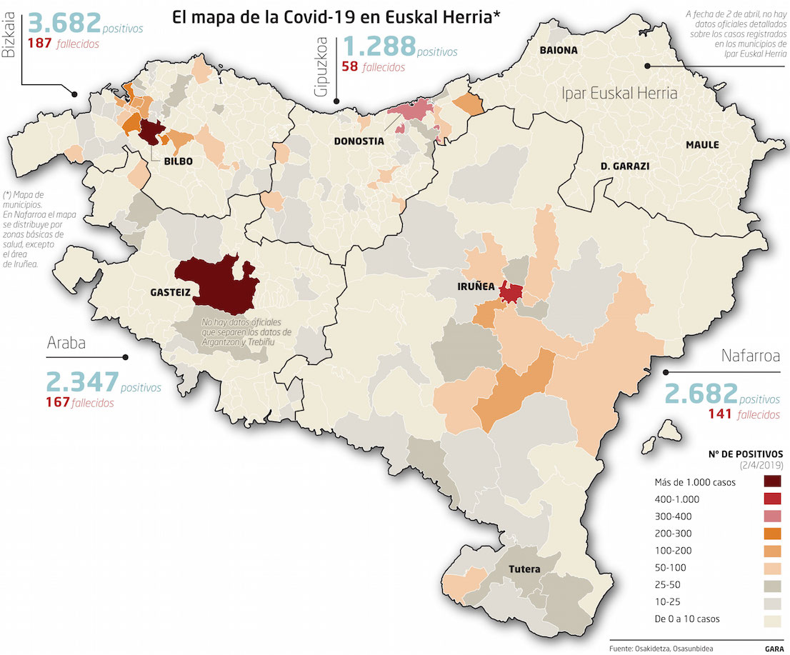 Estas dos urbes son las únicas que, a fecha de 1 de abril, han superado los 1.000 casos. La capital alavesa, que tomó ventaja desde un principio, cuenta ya con 1.955 positivos, mientras que la vizcaina está en 1.131. Iruñea no está lejos, con 970; en este caso, las zonas básicas de Osasunbidea no coinciden exactamente con el término municipal y, por ejemplo, no hemos sumado los casos de la zona de Zizur-Etxebakoitz.