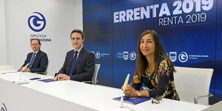 El diputado foral de Hacienda y Finanzas de Gipuzkoa, Jabier Larrañaga, acompañado por el director de Hacienda, Jokin Perona, y la subdirectora de Gestión Tributaria, Yolanda Domínguez, presentaron ayer las novedades de la campaña de la renta, que arrancará el lunes condicionada por el confinamiento.