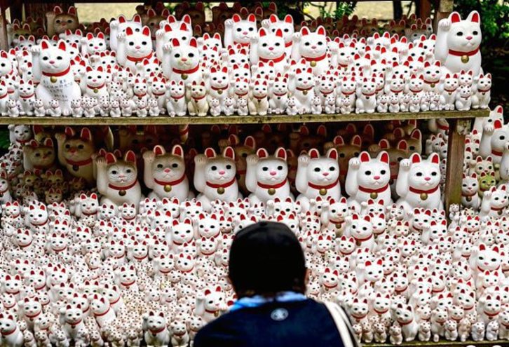 Dice la leyenda (una de ellas) que un señor feudal se cobijó de una tormenta junto a un templo en Edo (antiguo Tokio) y un gato, con la pata en alto, le invitó a entrar. Poco después, un rayo partió el árbol bajo el que se había protegido el hombre, que se hizo amigo del pobre sacerdote y, agradecido, reconstruyó el templo Gotoku-ji, adonde la gente llevaba figuras de gatos cuando se cumplían sus deseos. Esa figura es un gato (neko) que invita a pasar (maneki), y se supone que atrae la fortuna. Un deseo nada desdeñable en tiempos de crisis como este.