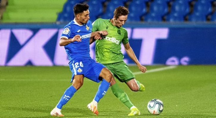 Tampoco hizo más el Getafe antes del descanso, porque la Real no concede apenas ocasiones, pero con nada, con un error arbitral, le bastó para tener el partido donde quería y a partir de ahí perdió todo el tiempo que pudo para intentar hacer valer su ventaja.
