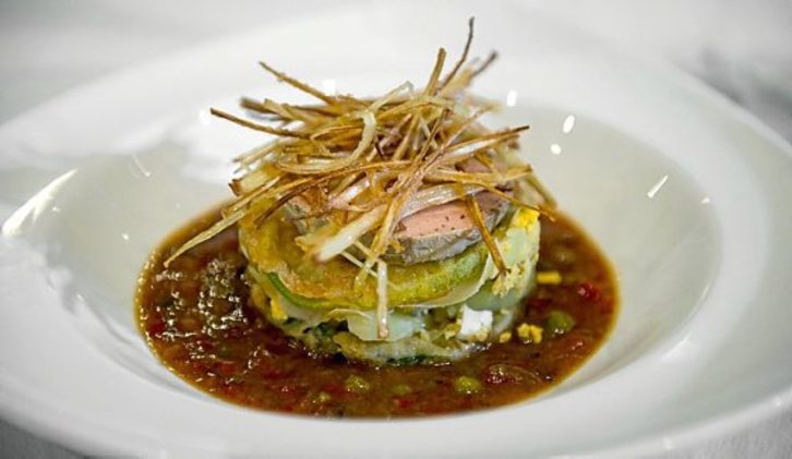 • Uztai bat erabilita osagaiak tartekatuz geruzak sortzen joan: alkatxofak, foiea, haragi papurtua.