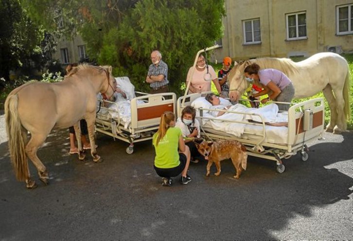 Ya no resulta novedoso hablar de este tipo de terapias, pero imágenes como está no dejan de chocar. En el Hospital de las Hermanas de la Misericordia de Karel Boromejsky, en Praga, la equinoterapia está dando excelentes resultados, según afirma el personal médico, que destaca la mejoría en el estado mental de los pacientes. Y cada vez son más quienes quieren probarla. Los cuadrúpedos que les visitan regularmente están entrenados de forma especial.