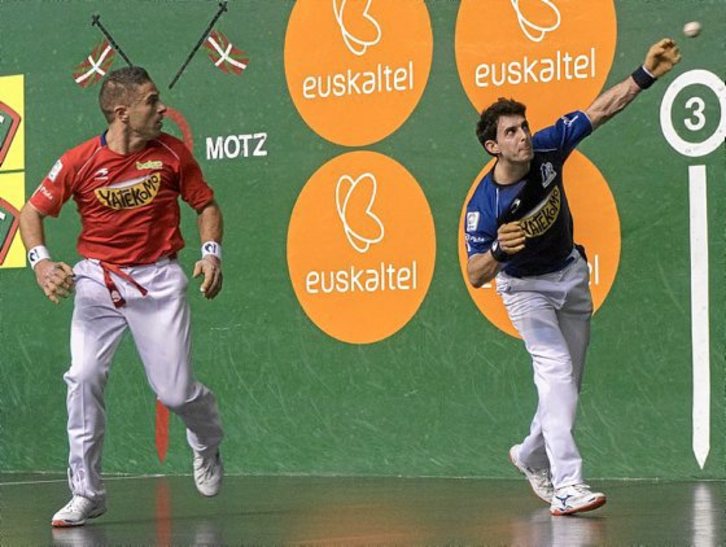 La remontada final, en este caso azul, no fue la única similitud con los precedentes de la primera fase, ya que el de ayer en el Adarraga volvió a ser un partido muy disputado, duro y peloteado, con muchas alternativas en el marcador, eso sí, con quizá excesivos errores para la categoría de los cuatro protagonistas. En este sentido, a los colorados penalizaron en exceso las ocho pelotas falladas por José Javier Zabaleta, cinco de ellas no forzadas.