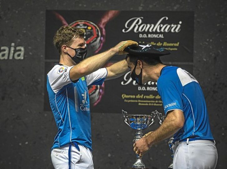 En una situación tan alrevesada como la actual en el mundo de la mano profesional, –por si todo lo derivado de la pandemia sanitaria fuera poco, para pelotaris y pelotzales resulta casi imposible abstraerse de la marejada de lo despachos– Iñaki Artola y Beñat Rezusta han tenido el gran mérito de no enredarse y, fieles a su estilo, saber imponer su descomunal pegada para refrendar que han sido, con diferencia, la pareja más sólida de este atípico verano. En una final de poca historia, pasaron por encima de Altuna III-Imaz, que no encontraron la forma de hacer frente a la notoria superioridad del de Alegia y, sobre todo, el de Bergara en el peloteo.