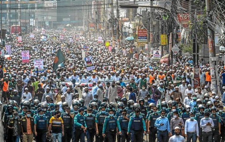 Samuel Paty paristar irakaslearen hilketaren harira, Emmanuel Macronek Mahomaren marrazkiak egiteari ez uzteko deia egin du. Deialdiak gehiengo musulmana duten herrialdeetan haserrea eragin du (irudian, Bangladesh). Era berean, Errepublikan adierazpen askatasunaren atzean ezkutatzen den arrazismo poskoloniala eta honi lotuta dagoen muturreko bazterketa soziala agerian gelditu dira, berriz ere.