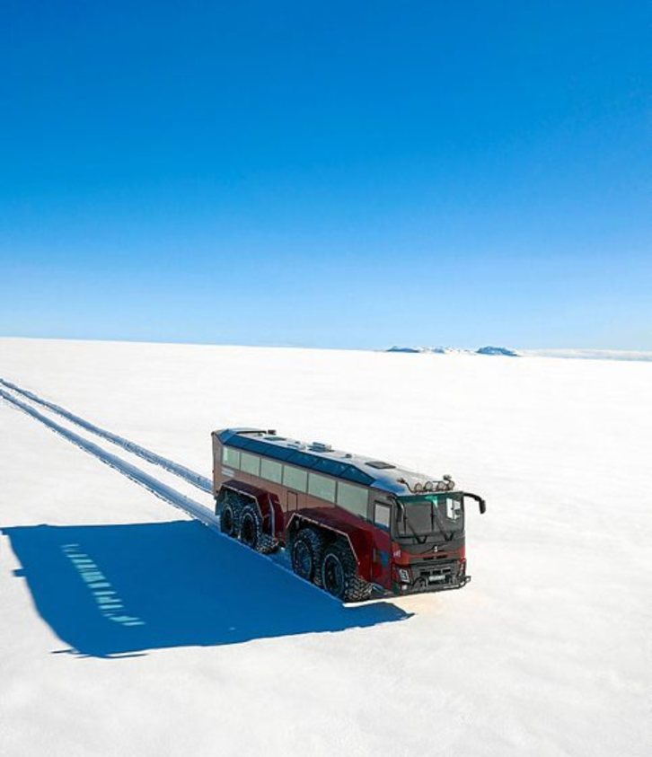 Bautizado como Sleipnir, el caballo de ocho patas del dios mitológico Odín, un autobús rojo de quince metros de largo y ruedas de dos metros de diámetro, muestra a los turistas el glaciar Langjokull, el segundo más grande de Islandia y en riesgo de desaparición para finales de siglo. El camino está jalonado de señales, de periodos de 20 años, que reflejan hasta donde llegaba el hielo y dan una idea de lo rápido que se está derritiendo. Desde 1890 se han evaporado 250 km2 de superficie. Fotografíaa: Halldor KOLBEINS | FOKU