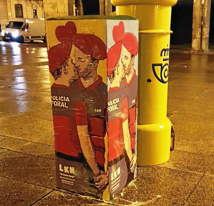 El artista urbano LKN actuó de madrugada en Iruñea para responder a la polémica que suscitó la retirada de uno de sus carteles por parte de la Policía foral, y dejó frente a su comisaría de la plaza del Castillo la imagen de un beso entre dos de sus agentes varones. El significado de la imagen va más allá de su contenido, ya que la pose de los forales es la misma que la del cartel retirado por sus compañeros hace un mes, y en la que aparecían María Chivite (PSN) y Bakartxo Ruiz (EH Bildu). Pero como a veces sucede con el amor, el cartel también fue efímero. A alguien le molestó lo suficiente como para dedicar un rato a desmenuzarlo concienzudamente y no dejar apenas rastro de él.