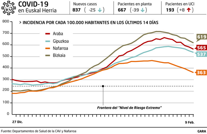 Más allá de la polémica generada por el auto del TSJPV que permitió ayer abrir los locales de hostelería en los municipios en zona roja, y a falta de ver si tiene o no consecuencias, la evolución epidemiológica es positiva en Hego Euskal Herria, con una incidencia decreciente en todos los herrialdes: hasta cien puntos menos en diez días en Nafarroa y en ocho días en Araba.