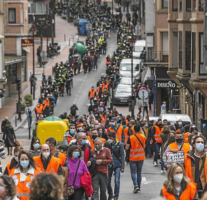 A mediodía de ayer, dos largas columnas de trabajadores de Tubacex hicieron entrada en la Herriko Plaza de Barakaldo, donde esperaba la plantilla de PCB-ITP Aero Casting para abrir una gran manifestación que recorrió el centro de la ciudad entre gritos de “Borroka de bide bakarra”, “Con tantas subvenciones no puede haber despidos” o un repetido &bs;“En Tubacex, PCB, Alestis, Aernnova, no sobra nadie”. En las plantas de PCB de Barakaldo y Sestao ya se han producido 83 despidos y ahora la dirección pretende un ERTE.