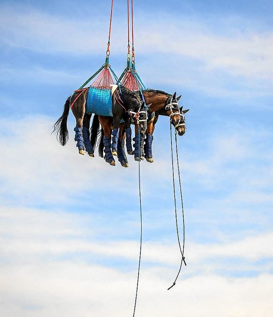 No son unicornios, pero estos caballos saben lo que es volar por los aires. Son equinos de la armada suiza, que ha prestado sus animales para un estudio veterinario que busca el modo adecuado de transportar caballos y otros animales pesados en helicóptero cuando resulten heridos. Una casuística que acostumbra a darse en lugares remotos en este pequeño país alpino.