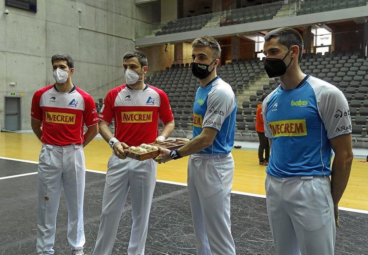 La pareja de Aspe, por su parte, tampoco puso ninguna pega a lo encontrado en el cestaño. «Por mi parte lo de siempre, no hay nada que decir en torno a las pelotas, son bonitas, sí que son diferentes, las suyas algo más vivas, las nuestras con algo menos bote y a ver si el domingo sale un buen partido», apuntó Danel Elezkano.