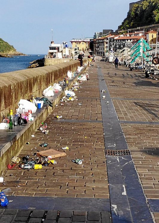 Esta imagen del puerto de Donostia sucio tras un botellón nocturno despertó gran indignación en las redes sociales, pues evidencia la incapacidad para controlar este tipo de conductas de riesgo una vez ha decaído el estado de alarma. La Ertzaintza dio cuenta de la celebración de estos botellones en las tres capitales de la CAV. Su información recoge intervenciones para disolver alguna de estas concentraciones, siendo respondidos los operativos con el lanzamiento de objetos en Artaza. También se incendiaron varios contenedores en la localidad de Eibar. Pese a ello, por lo general, el respuesta fue la de correr para evitar la denuncia. En total, la Ertzaintza impuso 55 multas. En Nafarroa, donde sigue vigente el estado de alarma, se denunció a cinco personas en Tutera.