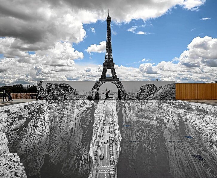 El artista callejero y fotógrafo francés Jean Rene, conocido como JR, ha creado un abismo que atraviesa el corazón de París, a los pies de su principal icono, la Torre Eiffel, donde la gente se hace el selfie más original gracias a la ilusión óptica que se ve desde el Trocadero. Nada más desplegar hace dos días su gigantesca obra, basada en la ampliación de sus fotografías en blanco y negro, se formaron largas colas para «despeñarse» por este cañón virtual. JR considera la calle la galería más grande del mundo.