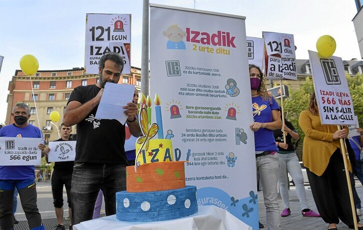 La plataforma Izadi Gurasoekin Etxera asegura que «la situación es de extrema gravedad, porque, si esto fuera poco, quedan solo 121 días para que llegue el tercer cumpleaños de Izadi y para que, por lo tanto, tenga que abandonar la prisión en la que hasta ahora ha convivido 24 horas con sus progenitores».