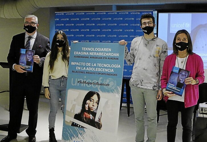 Isidro Elezgarai, presidente de Unicef en la CAV, presentó los resultados en el espacio Yimby de Bilbo. Indicó que la edad media de adquirir el primer móvil son 11 años, con acceso a internet lo tiene el 96,8% , y el 91,3% se conecta todos o casi todos los días. Respecto a los hábitos de uso, el 31% reconoce utilizar Internet más de 5 horas al día entre semana, el 21,1% se conecta a partir de las doce de la noche y el 63,8% lleva el móvil a clase.