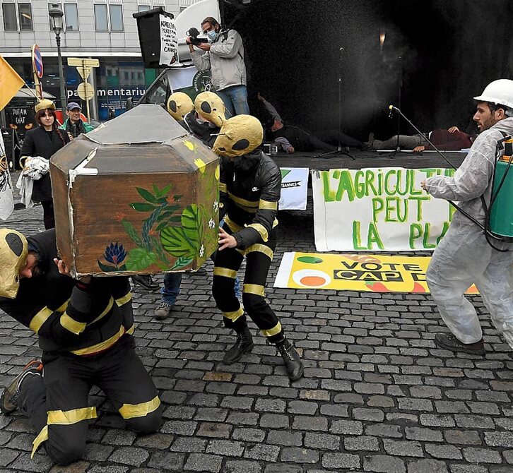 Pancartas llamando a votar contra la PAC y a retirar la reforma que está a punto de votarse en la Eurocámara dejaban bien a las claras el motivo de la manifestación celebrada ayer en Bruselas. Agricultores y representantes de organizaciones agrarias se movilizaron en la plaza de Luxemburgo, junto a la sede del Parlamento Europeo, en contra de la reforma de la Política Agraria Comunitaria (PAC) y del vicepresidente comunitario para el Pacto Verde, Frans Timmermans. «No hay que votar esta PAC. Hay que hacer otra PAC para responder a los retos», señaló Sabine Renteux, representante del Movimiento de Acción Campesina, después de que se asegurara que esta política agrícola es «totalmente incoherente con el Pacto Verde».