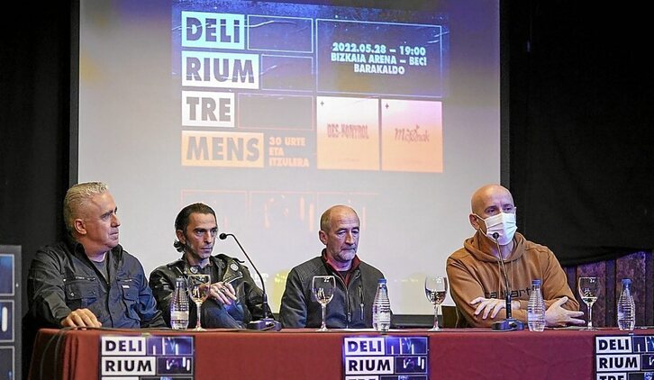 Justo 30 años después de su último concierto, ofrecido el 30 de noviembre de 1991, Delirium Tremens dio a conocer los pormenores de su reencuentro musical: nuevo disco, nuevo videoclip y, al menos, un concierto en el que presentarán los nuevos temas. Para volver a ver al histórico grupo de Mutriku de nuevo sobre el escenario, tendremos que esperar hasta mayo de 2022, cuando se cumplirán 35 años desde la creación de Delirium Tremens. Así lo anunciaron ayer en Bilbo los miembros actuales del grupo, Andoni Basterretxea, voz y guitarra; Patxi Irisarri, bajo; y Juantxo Yurrita ‘Txufu’, batería. Y fue en el mismo espacio, el Kafe Antzoki de Bilbo, sobre el que hace casi dos años el grupo se reunió por última vez para homenajear al desaparecido Iñigo Muguruza, miembro del grupo entre los años 1990 y 1991.